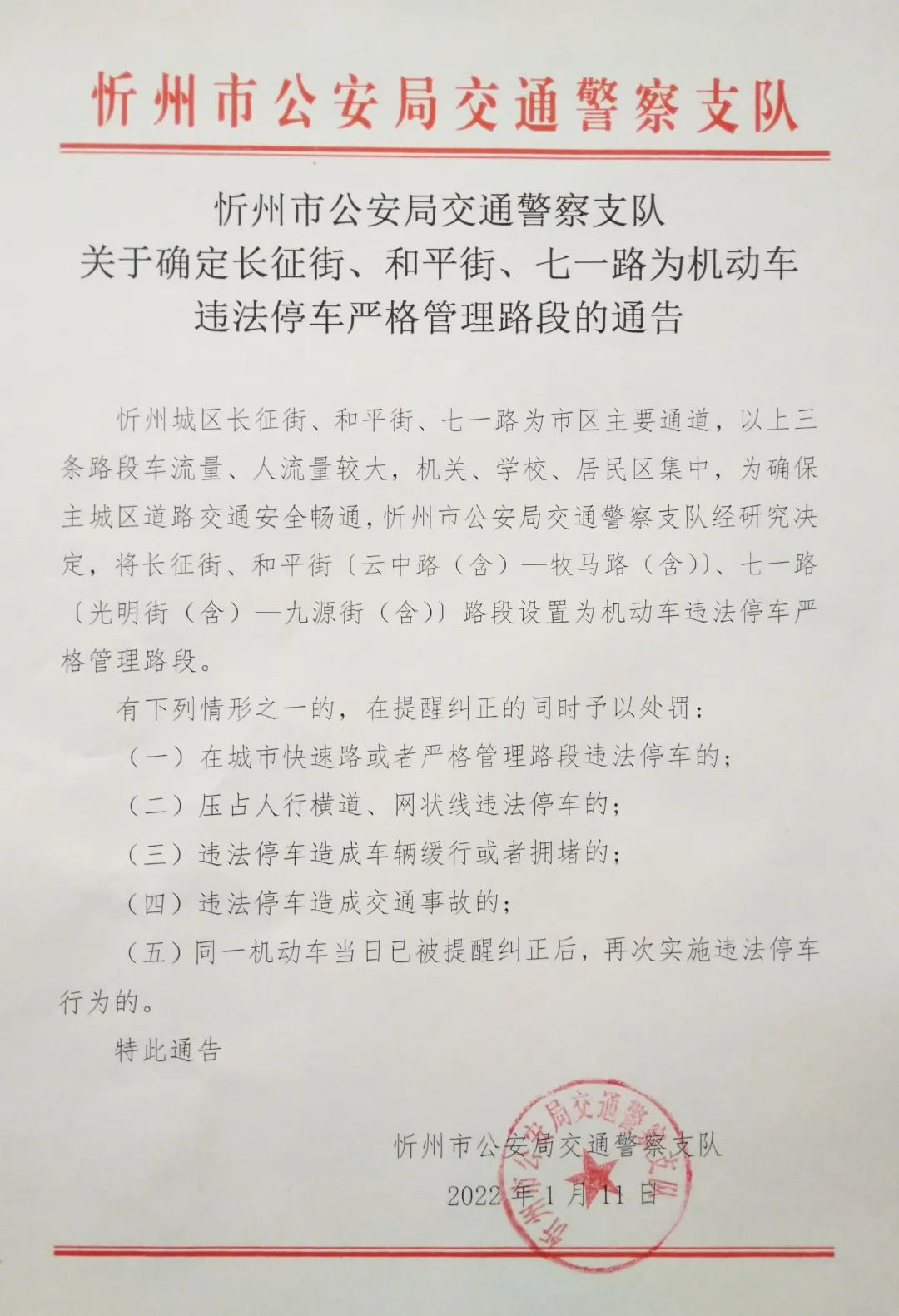 忻州城區(qū)長征街、和平街、七一路為市區(qū)主要通道,以上三條路段車流量、人流量較大,機關(guān)、學校、居民區(qū)集中,為確保主城區(qū)道路交通安全暢通,忻州市公安局交通警察支隊經(jīng)研究決定,將長征街、和平街[云中路(含)-牧馬路(含)]、七一路[光明街(含)-九原街(含)]路段設(shè)置為機動車違法停車嚴格管理路段。