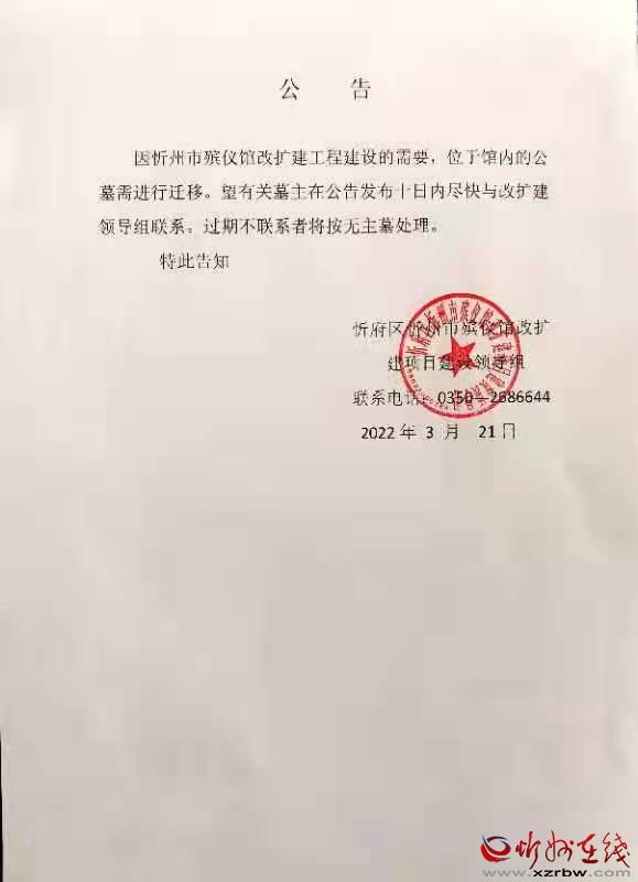 公 告 因忻州市殯儀館改擴建工程建設(shè)的需要,位于館內(nèi)的公墓需進行遷移(不涉及骨灰寄存)。望有關(guān)墓主在公告發(fā)布十日內(nèi)盡快與改擴建領(lǐng)導(dǎo)組聯(lián)系。過期不聯(lián)系者將按無主墓處理。 特此告知。 忻府區(qū)忻州市殯儀館改擴建項目建設(shè)領(lǐng)導(dǎo)組 聯(lián)系電話: 0350--2686644 2022年3月21日