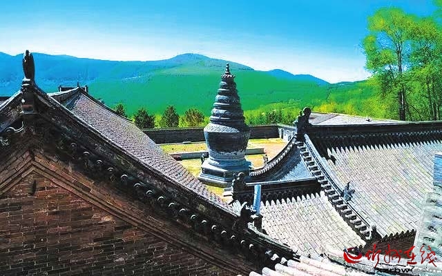 從忻臺旅游公路駛?cè)肱_豆線,燦爛輝煌的金閣古寺就位于南臺和中臺之間的金閣嶺上,海拔1900米,宛若天上宮闕。初秋時節(jié),遠處山色空蒙,峰巒凝碧,近處樹蔭蔽日,曲徑通幽。累代的晨鐘暮鼓及戰(zhàn)亂的刀光劍影都散落在歲月深處,輕柔的風拂過往事滄桑。