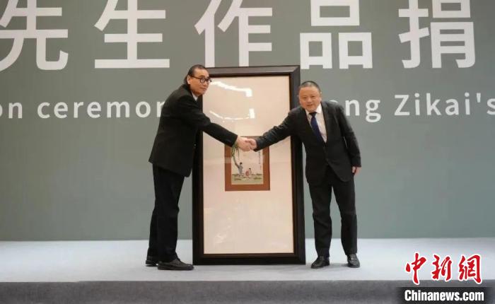 中國國家畫院院長劉萬鳴(左)接受豐子愷家屬捐贈(zèng)的豐子愷國畫作品。 中國國家畫院供圖