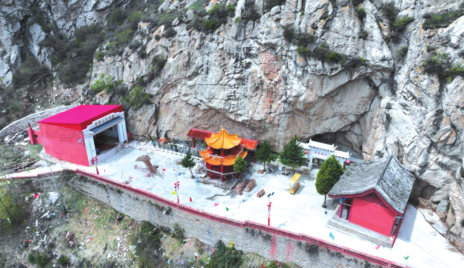春日里,山桃花與山杏花沿坡綻放,粉白相間的花海從山腳漫至山腰,與翠綠的松柏相映成趣。此時若恰逢細雨,云霧在花間游走,“巾巖瀨雨”的奇景尤為靈動,水滴擊石的清音與花開的簌簌聲交織,仿佛天地間的私語。盛夏時節(jié),山中松濤陣陣,涼意襲人。雙巾峰下的“沁心泉”水量充沛,泉水清冽甘醇,飲之可去暑熱。沿山路行至“回音壁”,一聲呼喊能引來七聲回應,故又稱“七響巖”。傍晚時分,夕陽為石灰?guī)r峰巒鍍上金邊,池面波光粼粼,形成“巾峰夕照”的景致,與“瀨雨”并稱山中雙絕。秋日登高,則見株株松樹挺拔直立,廟宇與油松交相輝映,層林盡染。此時“瀨雨”之景尤為別致,洞內泉水如鐘表滴答,當地人稱為“秋漏”。有現代詩人描繪此景:“巾巖雄峙,霧繞云纏多靈氣;瀨雨淋漓,珠垂墜玉一奇觀。”形象地把自然之音與時間之感巧妙融合。冬雪初霽時,巾字山銀裝素裹,雙巾峰如白玉雕琢的冠冕,“瀨雨”洞洞外凝結的冰棱如水晶簾幕,陽光折射下七彩斑斕,構成冬日里的清麗樂章。