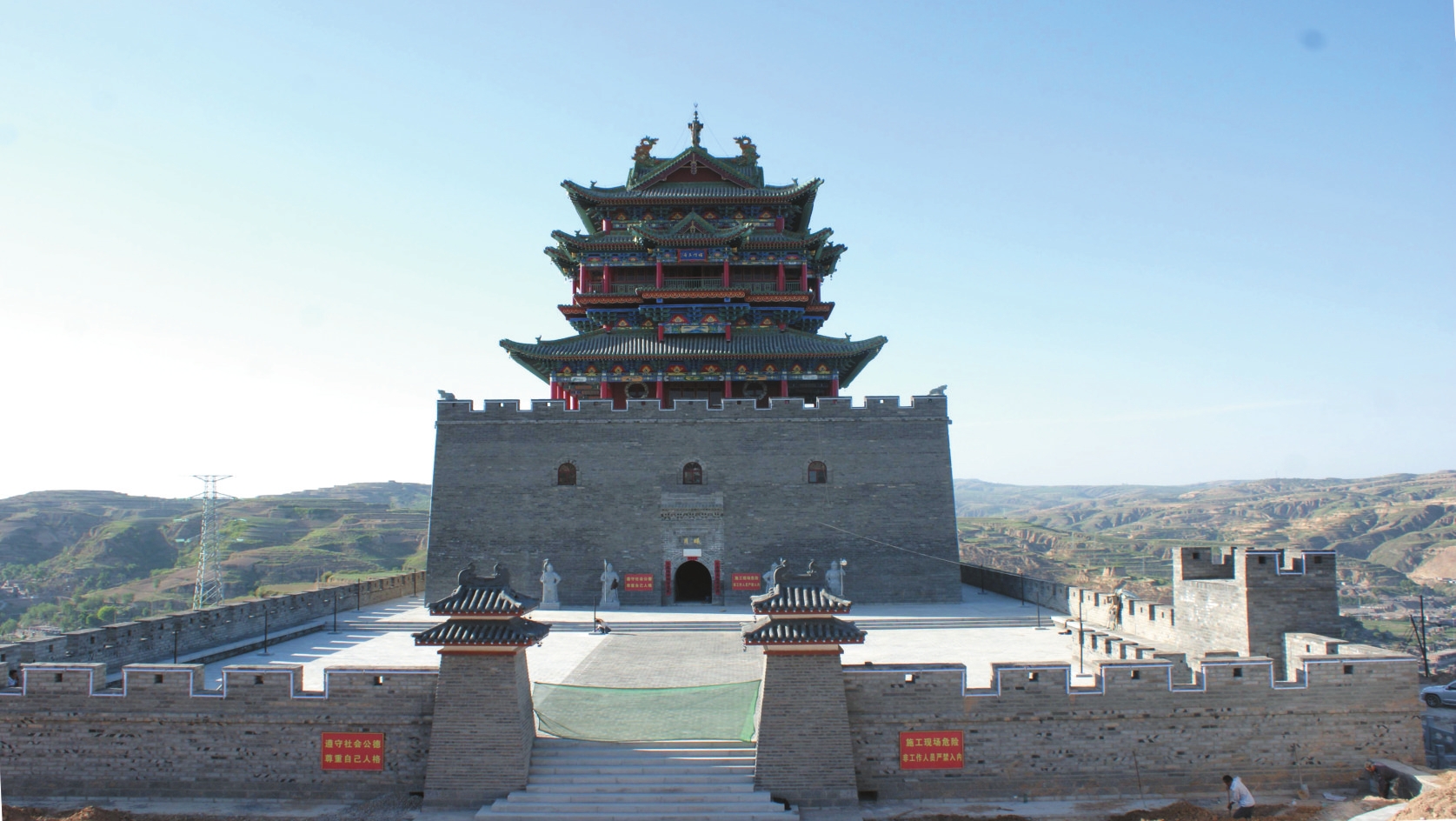 2011年至2012年,護城樓于原址復建為鋼筋混凝土仿古建筑。新建城堡南北長70米、東西寬36米,堡東開一拱門,外包磚,內(nèi)填素土并夯實,城墻上砌筑垛口。護城樓為方形,通高28.8米,其中墩臺高12米、寬28米;樓身高19米、寬20米。