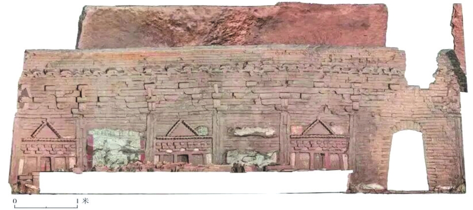 該墓葬為仿木構(gòu)磚雕壁畫墓,墓葬坐北朝南,由墓道、甬道和墓室三部分組成。墓葬裝飾采用磚雕和彩繪相結(jié)合手法。
