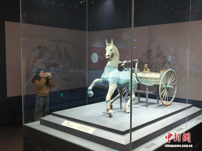 2月6日,游客在資陽市博物館打卡被譽(yù)為“中國漢代第一車”的資陽銅車馬。陳選斌 攝