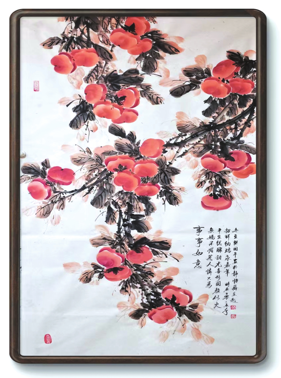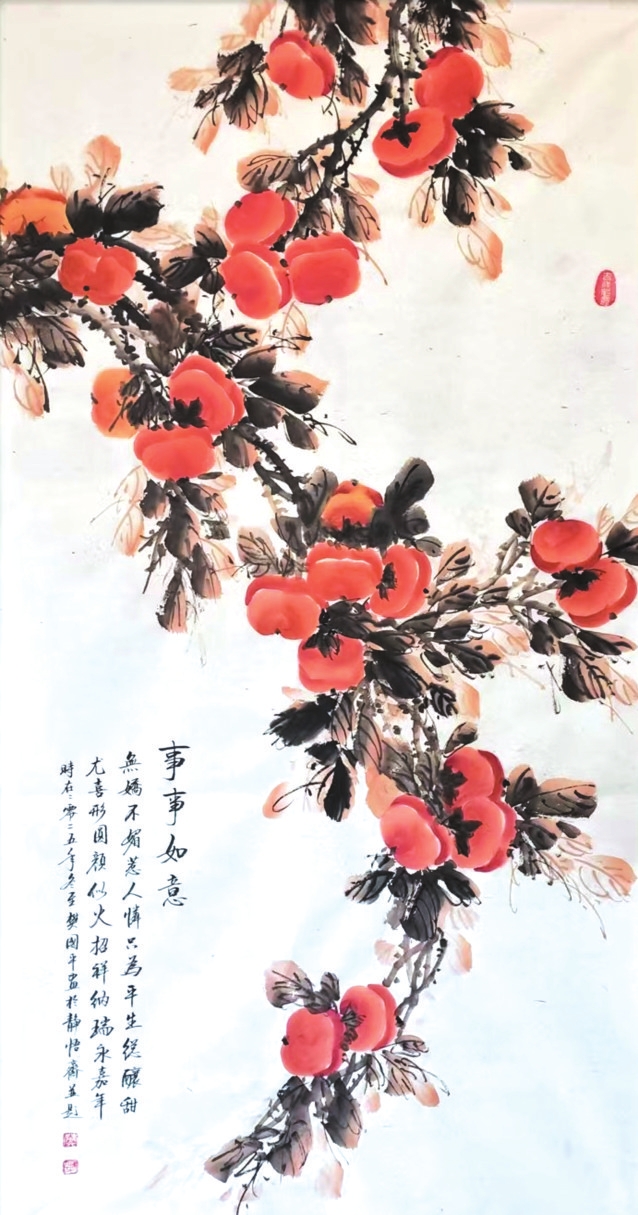 在樊國平眾多題材探索中,《事事如意》系列柿子圖可謂其藝術(shù)精神與人生哲思的縮影。這些作品超越了尋常花鳥畫的怡情悅性,成為她寄托情懷、叩問生命的重要載體。畫中那一串串、一簇簇丹柿,色澤溫潤,形態(tài)豐盈,承載著諧音“事事如意”的吉祥寓意,滿足了社會對美滿生活的樸素祈愿。她以此通俗意象為入口,引領(lǐng)觀者步入一個融匯儒、道、佛哲學(xué)理念的深邃境界,實踐著中國藝術(shù)“技進(jìn)乎道”“以畫載道”的至高追求。