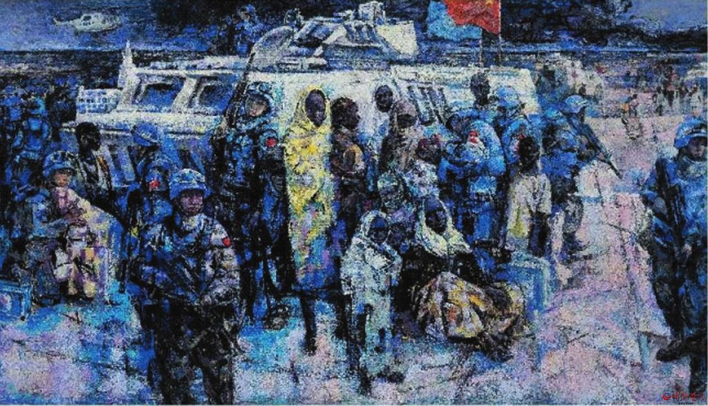 在續(xù)鶴賢眾多的作品中,從畫面表現(xiàn)效果方面,我是比較喜歡《和平使命——藍(lán)色交響曲》這幅作品的。無論畫面構(gòu)圖、色彩關(guān)系,還是人物造型以及表現(xiàn)技巧,都堪稱完美。畫面中無論人物形象、動態(tài)、表情,還是人與自然背景,都處在一種和諧美好的關(guān)系中,從一個(gè)新的角度給予美好詮釋。這幅作品表現(xiàn)的是我們的維和部隊(duì)“子弟兵”以自己的生命守護(hù)著世界和平,講述著構(gòu)建人類命運(yùn)共同體的大國情懷。 (邢晨聲 文