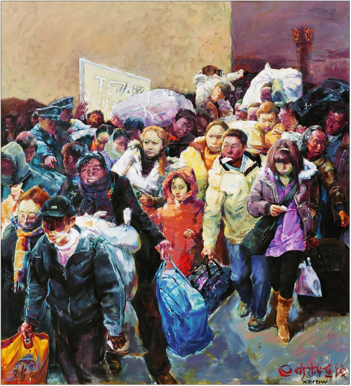 《春潮——回家過年》這幅作品是典型、真實(shí)的社會現(xiàn)實(shí)和人性本真的寫照,這個(gè)瞬間定格了一段讓多少人刻骨銘心的記憶,敘述了周期性的人類大遷徙——春運(yùn)。該畫所蘊(yùn)涵的是中國人心中那份最飽滿的希望。旅客是彼此都不認(rèn)識的陌生人,為了一個(gè)回家的目的,毫無距離地?cái)D在一起,人物個(gè)性鮮明。畫家具有強(qiáng)大的創(chuàng)作能力和藝術(shù)表現(xiàn)力。邢晨聲 文