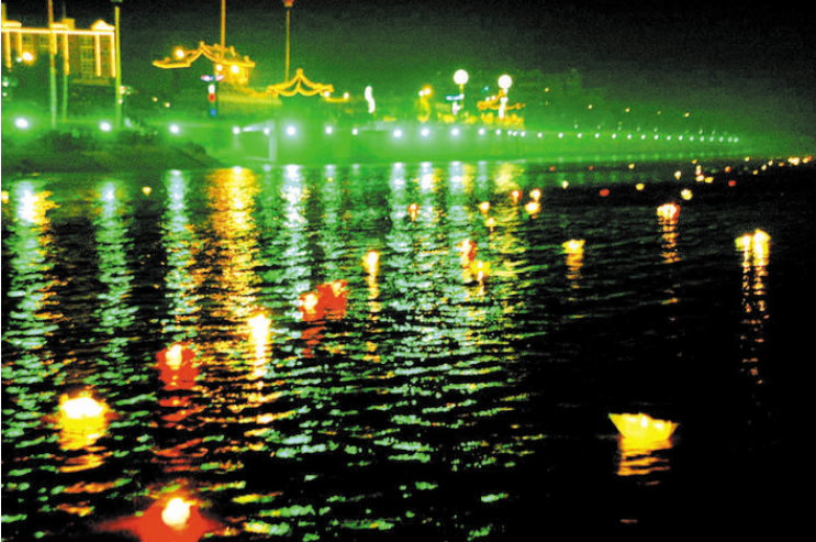 中元節(jié)這一天也有放河燈的習(xí)俗,最早源于印度佛教,傳入中國,是由寺院興起,起初有盂蘭盆會,在寺院里,誦經(jīng)供食,焚化紙船,謂之法船,可以“渡出冥孤獨之魂”,也是一種宗教儀式。后來這種形式,逐漸傳入民間社會,有了在河流中放河燈的習(xí)俗。試想天上人間,天上明月高空,繁星點點,地下一排排的紙船,在暗夜的黃河流水中猶如萬點螢光,向著遙遠的神秘方向漂流,讓人產(chǎn)生一種無限的想象,因此,在中元節(jié)放河燈,就是自己和心靈的一種對話,也是活著的人們對逝去的人們的一種懷念方式。當(dāng)然河曲河燈節(jié),在祭祖、祭禹的同時,也加入了特定群體。那些在黃河水患中離去的人,那些在戰(zhàn)亂中逝去的人,那些在走西口謀生中失蹤的人,都成為被祭奠的亡靈,體現(xiàn)了其節(jié)日的地域性。