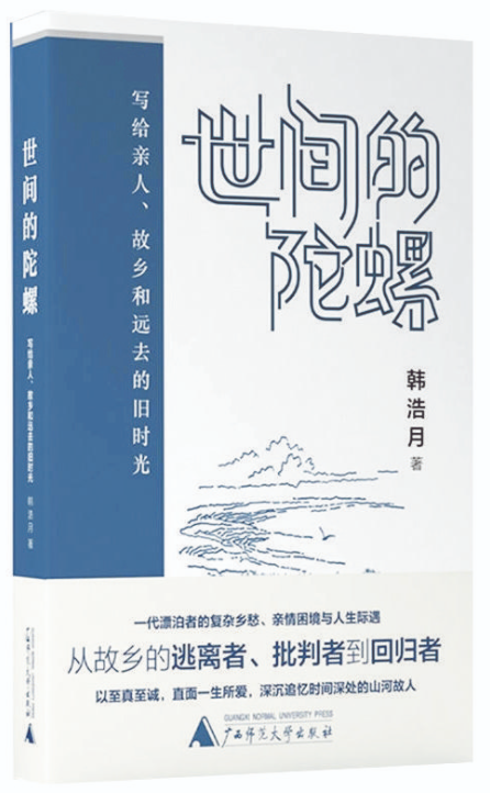 人不管走得多遠(yuǎn),最終都要和故鄉(xiāng)的人、故鄉(xiāng)的山河、故鄉(xiāng)的那段歲月握手言和。在《世間的陀螺》這本散文集里,韓浩月把故人、故鄉(xiāng)、故事一一請(qǐng)進(jìn)書中、銘刻心間,讓其成為自己生命中的光亮,照耀未來的道路。如他自己所說的,“從一個(gè)出走者和背叛者變成一個(gè)回歸者”,回歸并不單指肉體層面,把故鄉(xiāng)一直裝在心里的人便是永恒的回歸者。無論親人是生是死,無論故鄉(xiāng)是新是舊,一直對(duì)其不離不棄的人,才是故鄉(xiāng)大地懷抱里永遠(yuǎn)長(zhǎng)不大的孩子——想哭就哭,想笑就笑,想跳就跳,想回來就回來。(張家鴻)