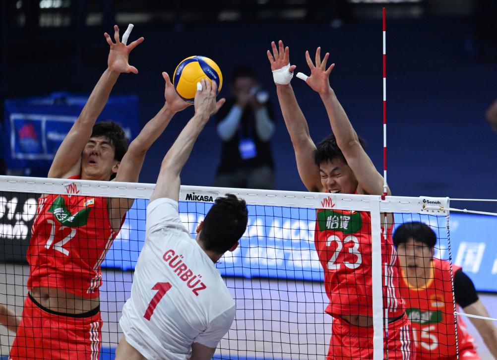 土耳其隊球員穆拉特·葉尼帕扎爾(左)、貝迪爾汗·比比爾在比賽中攔網(wǎng)。新華社記者 張博文 攝