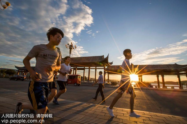 2017年7月20日,在江西都昌縣東湖畔,人們迎著朝陽(yáng)晨跑。(傅建斌/人民圖片)