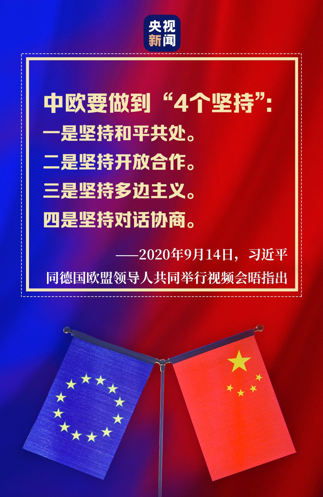 中歐相互尊重、求同存異、和而不同,不斷增進(jìn)彼此理解和信任,在合作中擴(kuò)大共同利益,在發(fā)展中破解難題。在當(dāng)天的視頻會晤中,習(xí)近平強調(diào),中歐要做到“4個堅持”。