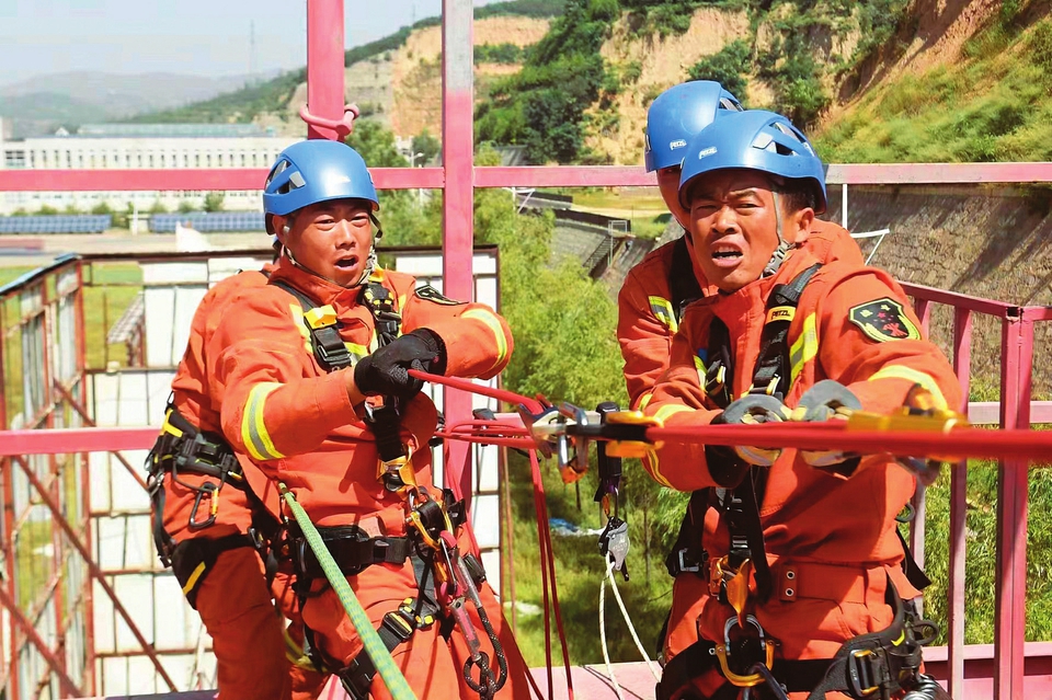 呂梁市消防救援支隊(duì)北川河西路特勤站消防員開展繩索救援訓(xùn)練。張文兵攝