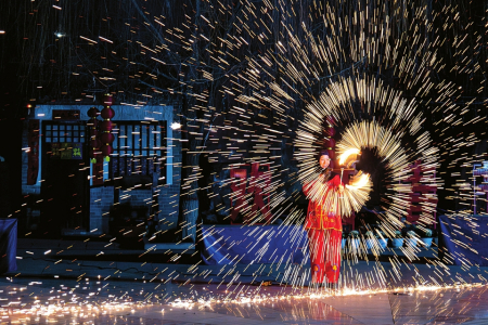 大槐樹景區(qū)在春節(jié)夜間游覽期間還邀請了網(wǎng)絡(luò)大火的“火”系非遺表演——“飛天鳳舞·鐵花魂”活動(dòng),其中囊括噴火、打火花、火壺等,為游客們奉上一場絢爛奪目的非遺盛宴。