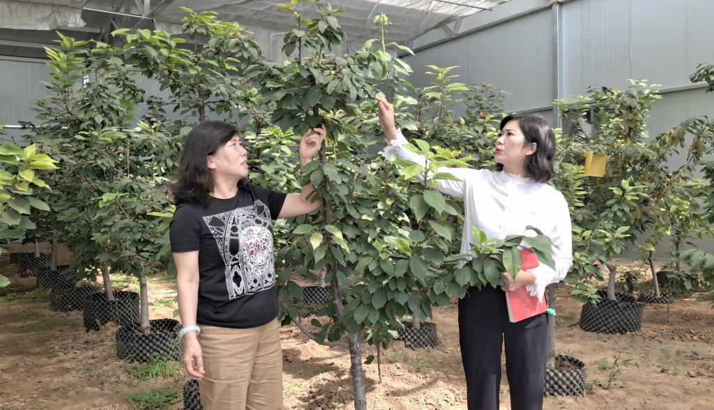 新路村黨支部書記、村委會主任劉翠萍與“櫻桃樹下”種植園有關(guān)負責(zé)人察看櫻桃長勢。張林泉 攝