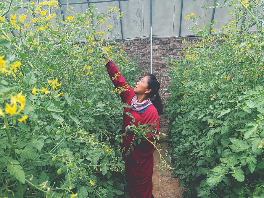山河村大棚采摘園的工作人員正在給小番茄打杈。本報實習(xí)記者姚雅馨攝
