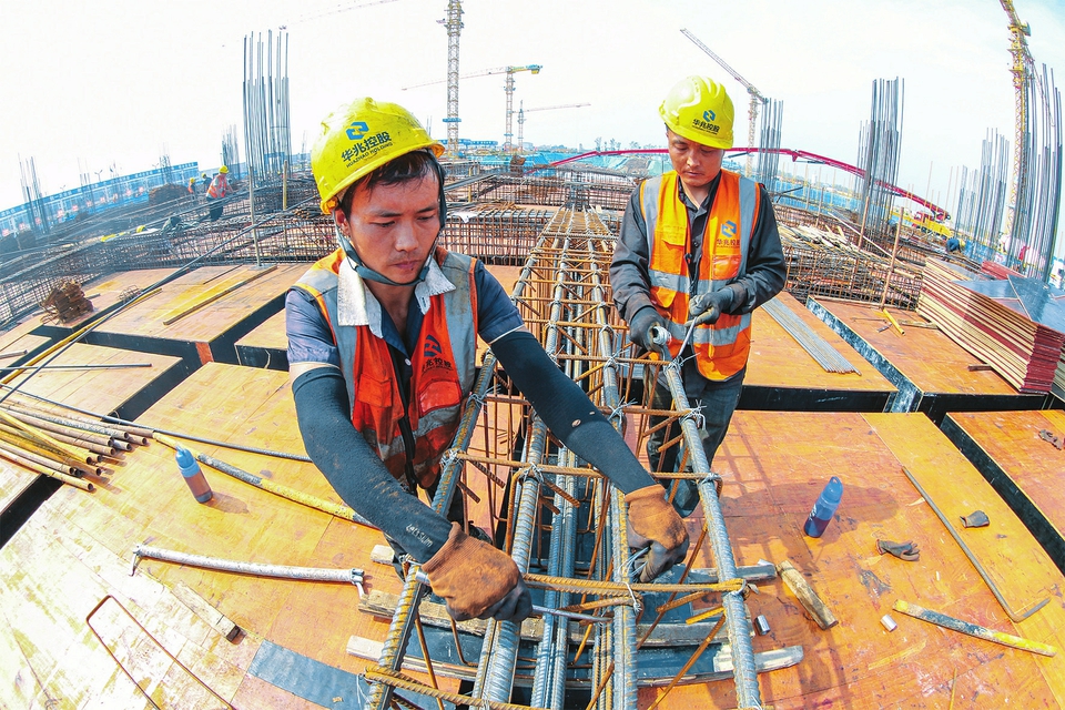 10月1日,建筑工人正在運(yùn)城市會(huì)展中心項(xiàng)目建設(shè)工地做基礎(chǔ)施工。國(guó)慶長(zhǎng)假期間,承建總建筑面積82萬平方米會(huì)展中心項(xiàng)目的運(yùn)城市建工集團(tuán)200余名建筑工人,堅(jiān)守施工一線,嚴(yán)格按照時(shí)間表、路線圖,采取人休機(jī)不停的晝夜輪班制施工,確保重點(diǎn)項(xiàng)目的有序推進(jìn)。(姜樺攝)