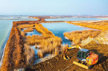施工人員正在對(duì)鹽湖堤埝進(jìn)行除險(xiǎn)加固作業(yè)。