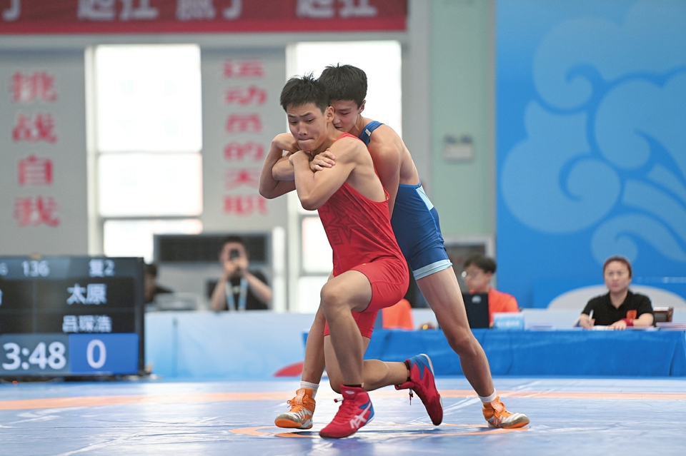 8月17日,省第十六屆運動會古典式摔跤比賽舉行,運動員們進行技術(shù)與力量的比拼。本報記者阮洋攝