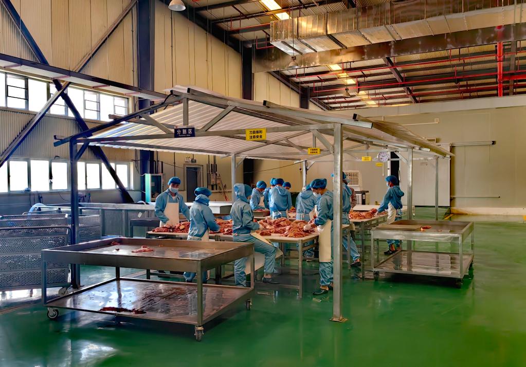 在海南紅焱食品有限公司廠房?jī)?nèi),工人們正在學(xué)習(xí)牛肉分解。新華社記者吳茂輝 攝