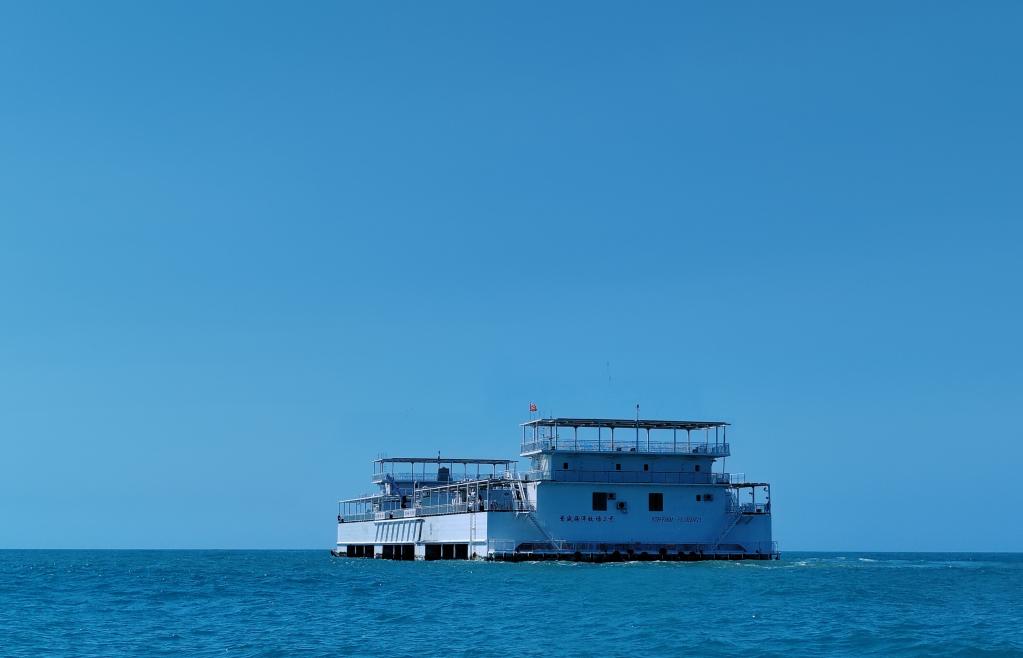 從海南省樂東黎族自治縣龍棲灣向外約8海里,可以看到“普盛海洋牧場3號(hào)”如同一艘白色郵輪泊在蔚藍(lán)色的大海之中。