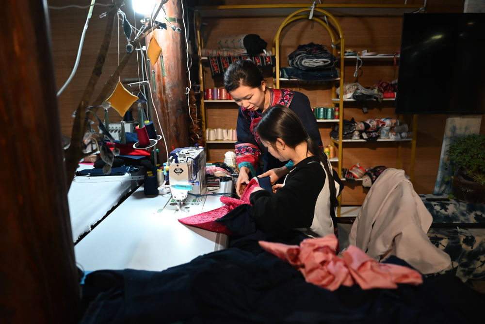 李利(后)在貴州省興義市萬(wàn)峰林景區(qū)門店內(nèi)與員工一起制作民族服飾(2024年2月19日攝)。新華社記者 劉續(xù) 攝