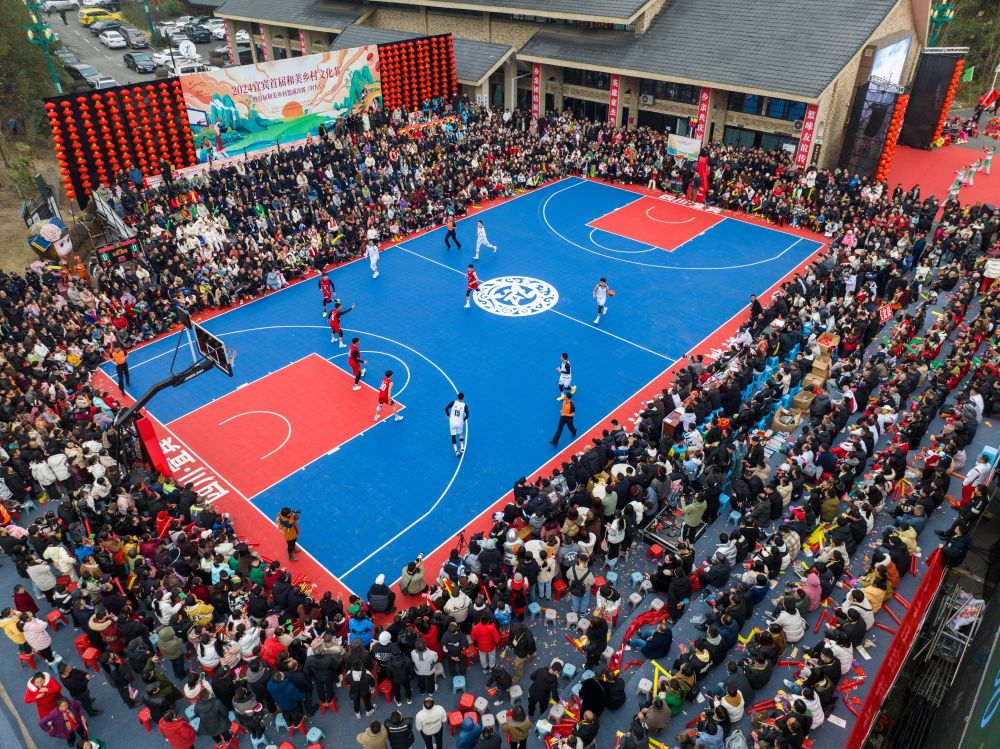 2024年1月29日,村民、游客在現(xiàn)場(chǎng)觀賽(無(wú)人機(jī)照片)。當(dāng)日,在四川省宜賓市珙縣巡場(chǎng)鎮(zhèn)三合村,2024宜賓首屆和美鄉(xiāng)村文化節(jié)暨首屆和美鄉(xiāng)村籃球決賽(村BA)舉行,同時(shí),現(xiàn)場(chǎng)還舉行了非遺年貨購(gòu)物節(jié)、消費(fèi)券發(fā)放等活動(dòng),以賽事經(jīng)濟(jì)激發(fā)鄉(xiāng)村活力。新華社發(fā)(莊歌爾攝)