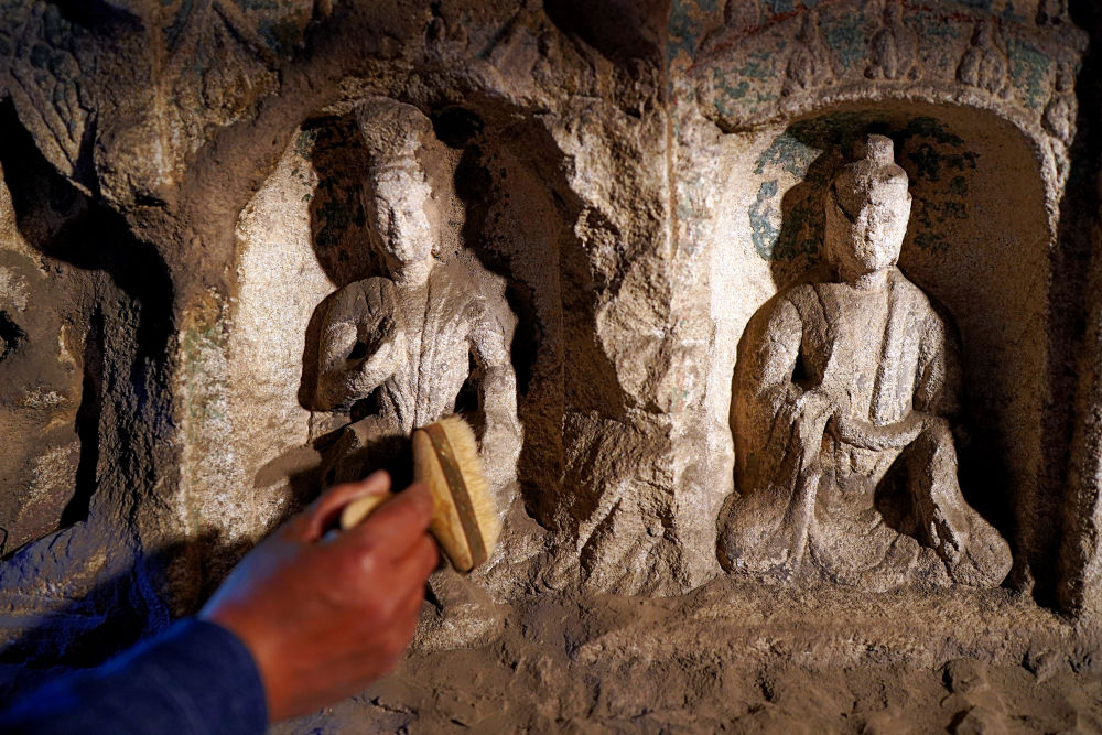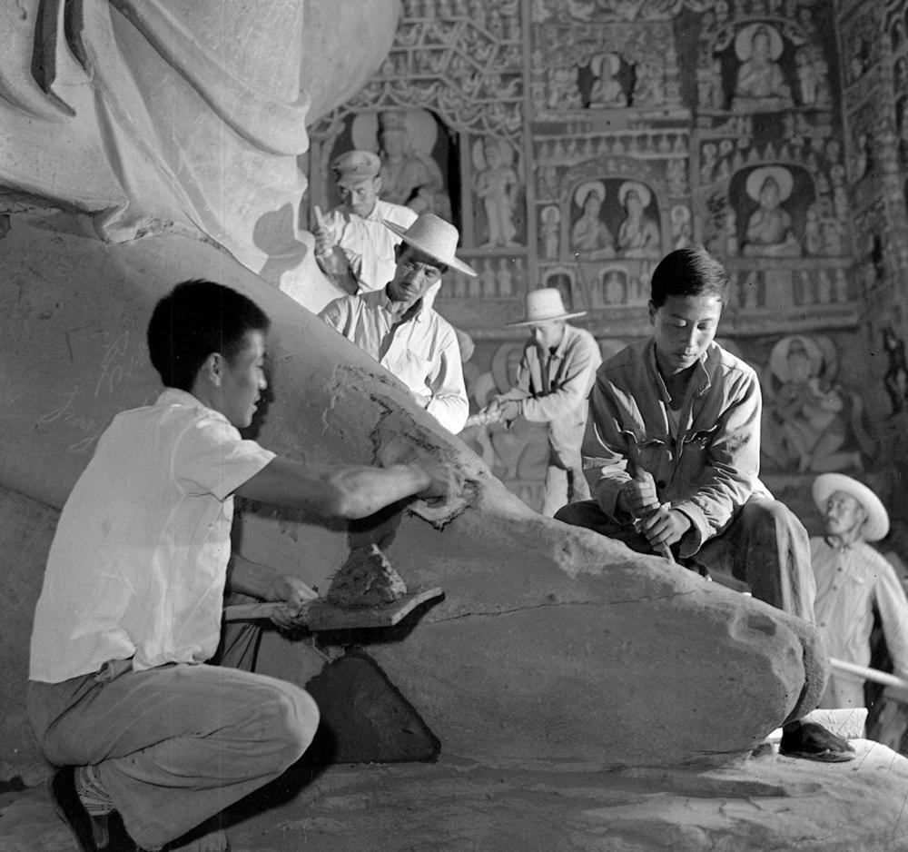 工人們?cè)谛扪a(bǔ)石佛(資料照片)。