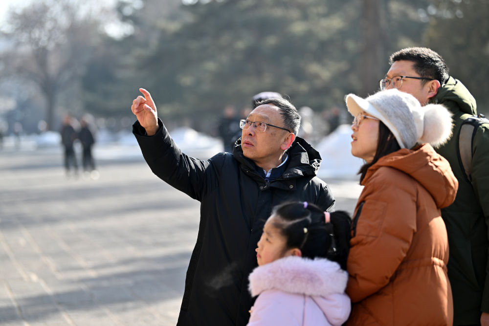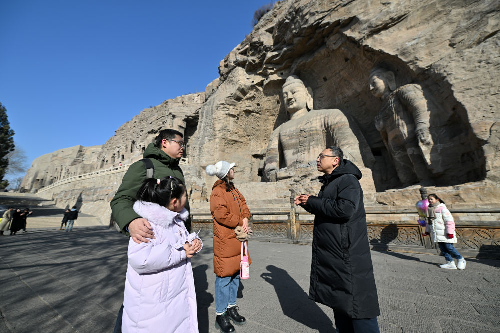 在山西大同云岡石窟,云岡研究院院長杭侃(右)在給游客講解石窟的歷史知識(shí)(2024年2月25日攝)。