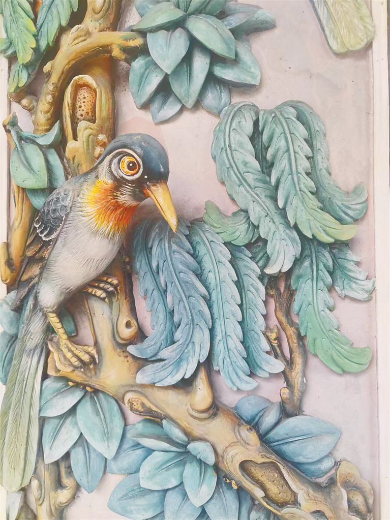 在海南的灰塑作品中,留白的運用同樣有“以無勝有”的視覺效果。“灰塑作品色彩五彩斑斕,一眼看過去容易產(chǎn)生錯亂的感覺,這時候留白就顯得很重要?!卞竞iw酒店負責人符燕舞說,灰塑作品有明顯的寫實風格,所呈現(xiàn)的物象紛繁多彩。如果要將灰塑作為一種藝術品保留下來,用留白的手法為作品增添美感十分必要。