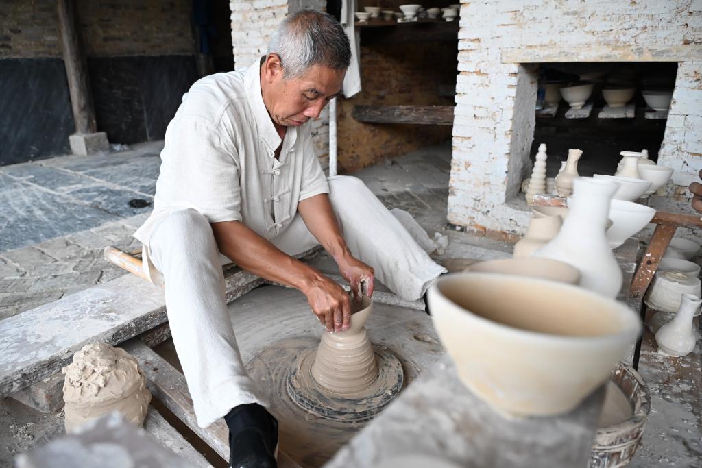 非物質(zhì)文化遺產(chǎn)傳承人宗鴻新在拉坯。新華社記者 隋尚君 攝