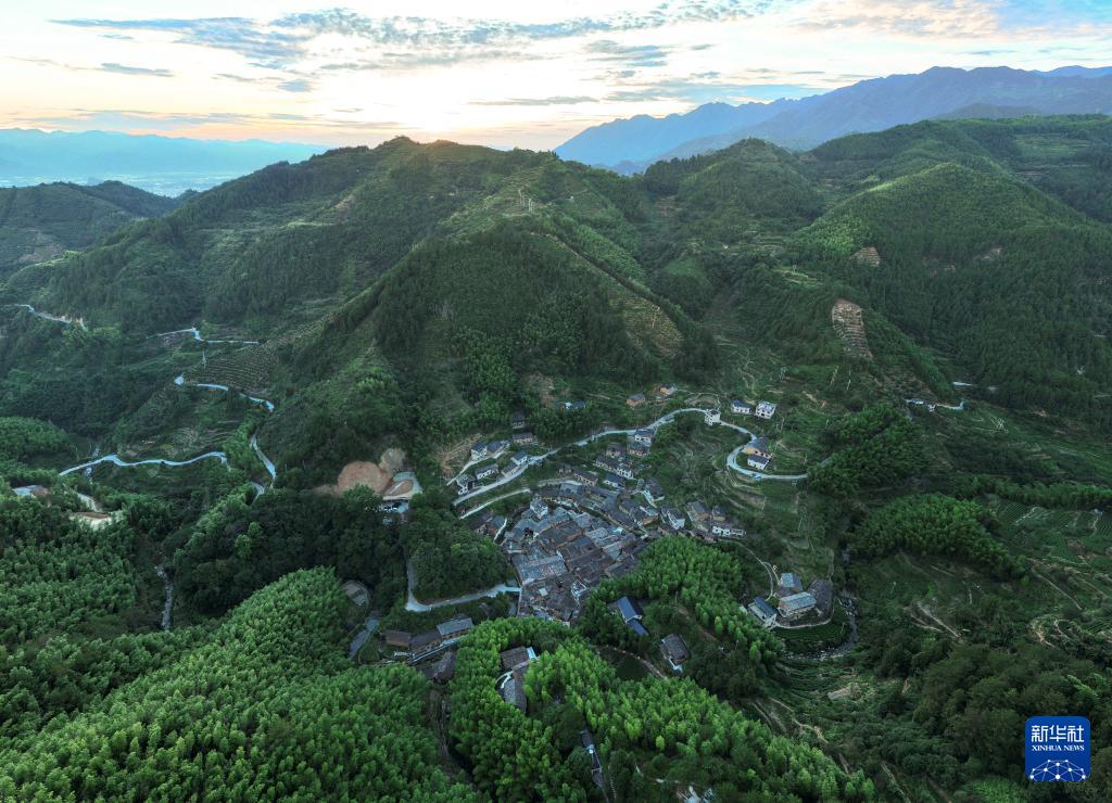 鳥(niǎo)瞰群山間的松莊村(無(wú)人機(jī)照片,7月17日攝)。(新華社記者 翁忻旸 攝)
