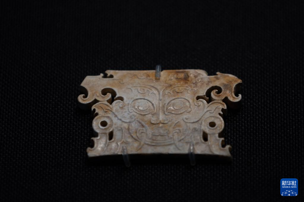 這是7月28日在重慶中國三峽博物館舉行的“玉出大江——長江流域史前玉器特展”上拍攝的肖家屋脊文化獠牙神面玉牌飾。(新華社記者 黃偉 攝)