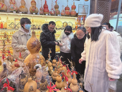 在吆喝聲此起彼伏的年貨市集,醒獅帽、剪紙、提燈等頗具年味的商品擺滿(mǎn)攤位,讓游客目不暇接,尤其是精美的葫蘆烙畫(huà)、面塑、扎染等非遺,既有傳統(tǒng)文化的風(fēng)韻,又融入現(xiàn)代設(shè)計(jì)巧思。