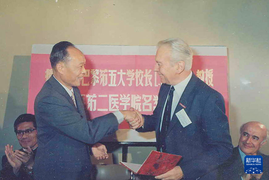 上海第二醫(yī)學(xué)院(現(xiàn)上海交通大學(xué)醫(yī)學(xué)院)校長(zhǎng)王振義(前左)授予法國(guó)巴黎第五大學(xué)校長(zhǎng)歐基埃名譽(yù)教授稱號(hào)(攝于1985年)。新華社發(fā)(上海交通大學(xué)醫(yī)學(xué)院供圖)