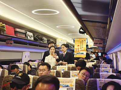 4月22日一早,在太原開往北京的書香列車上,山西晚報記者看到了這樣一幕。車廂內(nèi),兩側(cè)車窗、行李架、衛(wèi)生間、洗漱臺等處張貼全民閱讀大會標識,營造了濃厚的活動氛圍。列車視頻和廣播循環(huán)播放全民閱讀大會宣傳片,介紹大會概況及“書香列車”情況。幾名年輕乘客圍在列車餐吧臺增設的“讀書角”,選取自己喜歡的讀物。列車工作人員利用流動小車,送書到車廂,為旅客提供圖書借閱服務。在車廂兩端、每個座位頭枕巾上張貼、印刷全民閱讀大會主題海報和“書香列車云閱讀”二維碼,不少旅客掃碼開始免費聽書、看書。