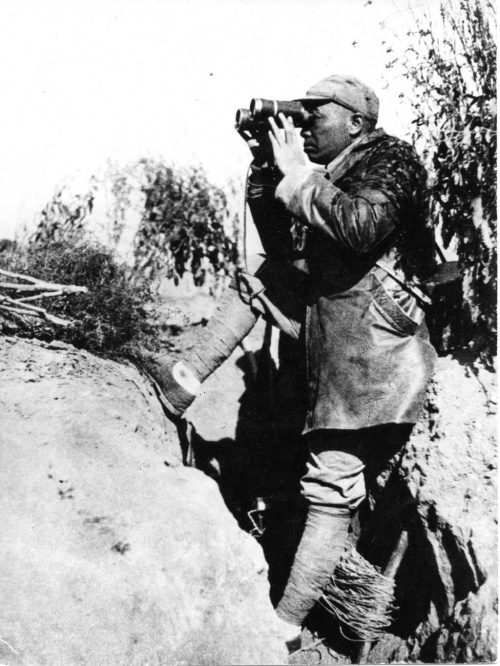 “誰(shuí)敢橫刀立馬,唯我彭大將軍?!闭掌校淼聭汛蟀雮€(gè)身體露在戰(zhàn)壕外,左腳踏在戰(zhàn)壕底,右腳蹬著戰(zhàn)壕前沿,坐靠在戰(zhàn)壕后沿上,手持望遠(yuǎn)鏡,神情專注地觀察戰(zhàn)況。