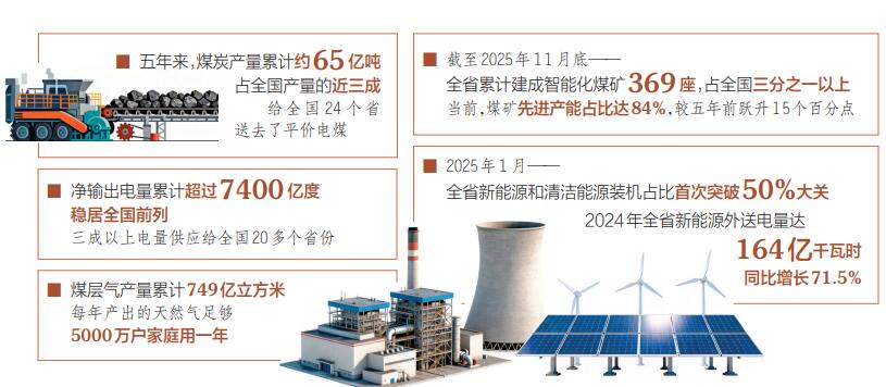 穩(wěn)產(chǎn)保供有力有效?!笆奈濉逼陂g,全省新增產(chǎn)能1.5億噸/年,日均產(chǎn)量穩(wěn)定在350萬噸以上,累計生產(chǎn)原煤約65億噸,占全國總產(chǎn)量的近三成;以長協(xié)價為24個省份保供電煤20億噸以上,有力保障了國家經(jīng)濟社會發(fā)展用能需要。